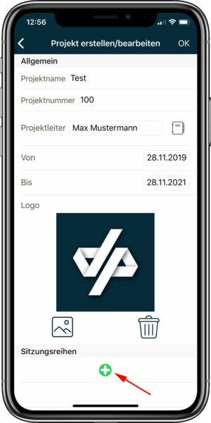 Mit einem „Klick“ auf das grüne + erstellen Sie eine Sitzungsreihe. Wichtig: Eine Sitzungsreihe können Sie nur erstellen, wenn ein Projekt erfasst ist.