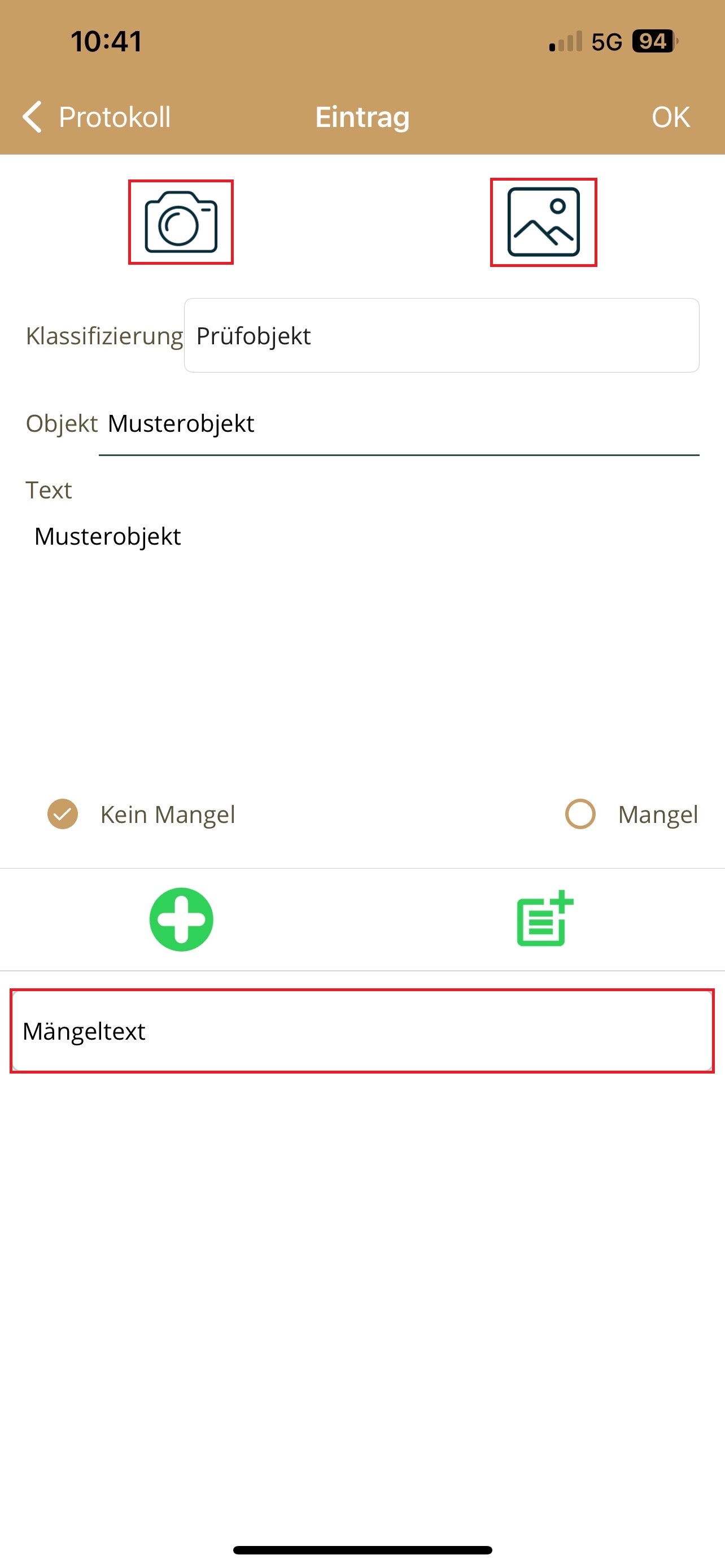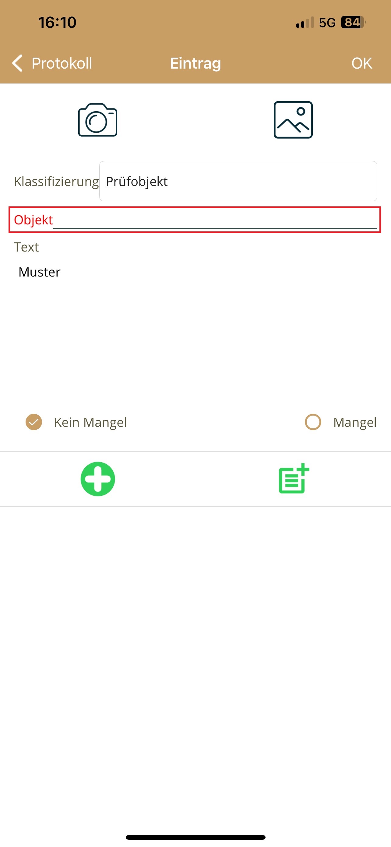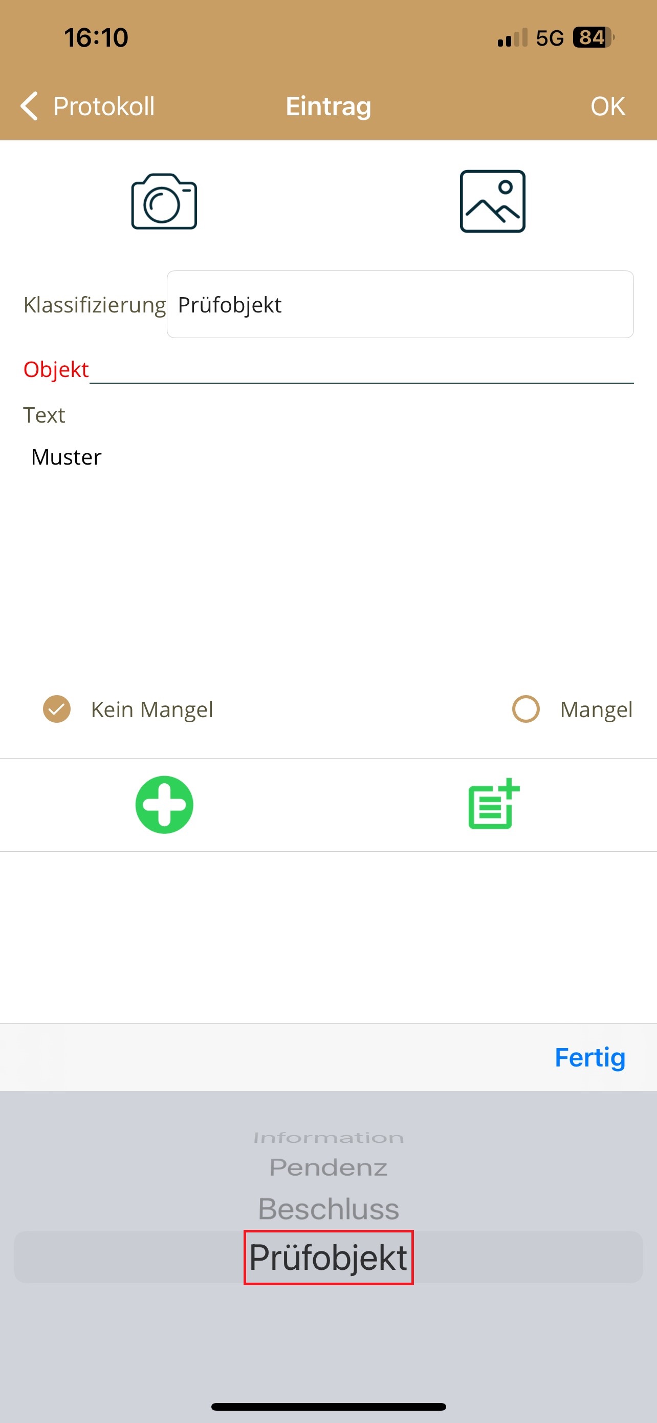Prüfobjekt: Beim Eintrag handelt es sich um ein Objekt, welches regelmässig anzutreffen ist. Das Prüfobjekt kann als "Mangel" klassifiziert werden. Bei einem "Mangel" lässt sich eine Person und ein Behebungsdatum hinzufügen.