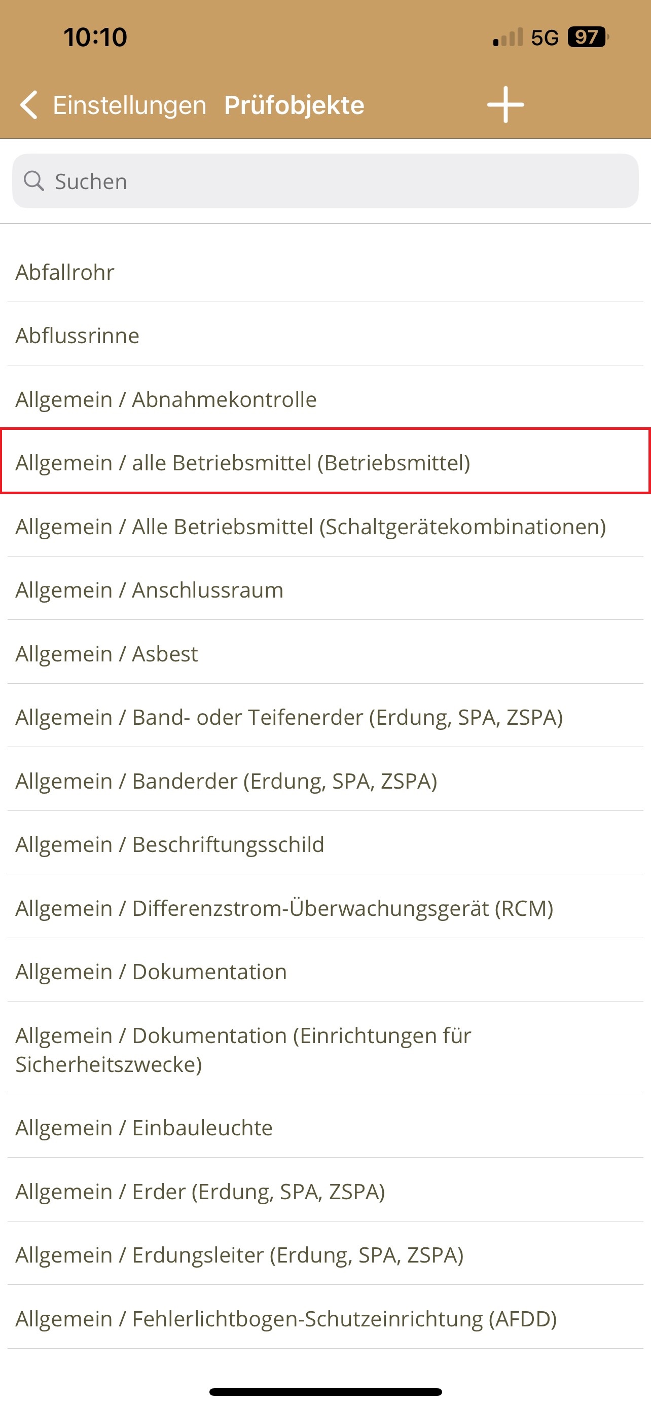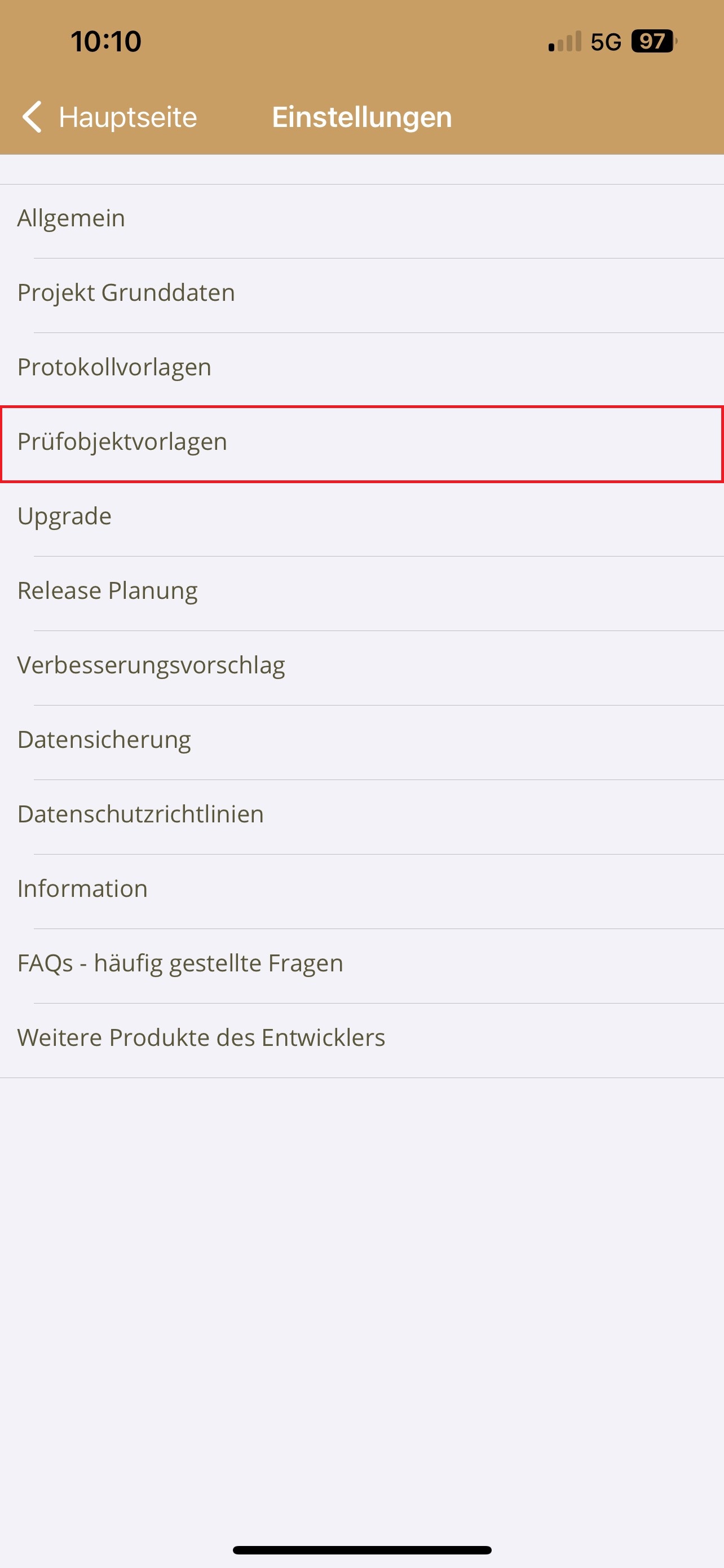 Gehen Sie in den Einstellungen auf „Prüfobjektvorlage“ und wählen Sie das passende Prüfobjekt aus.