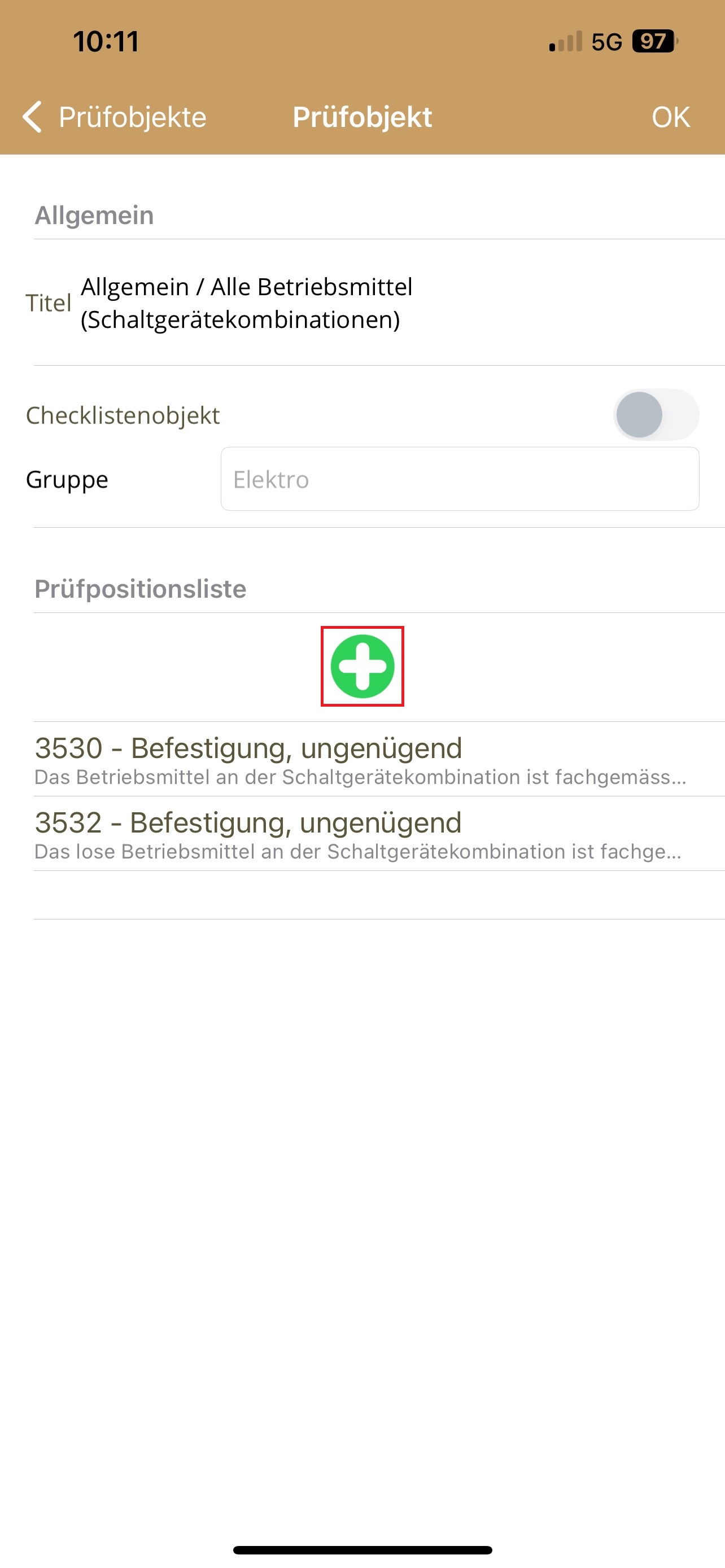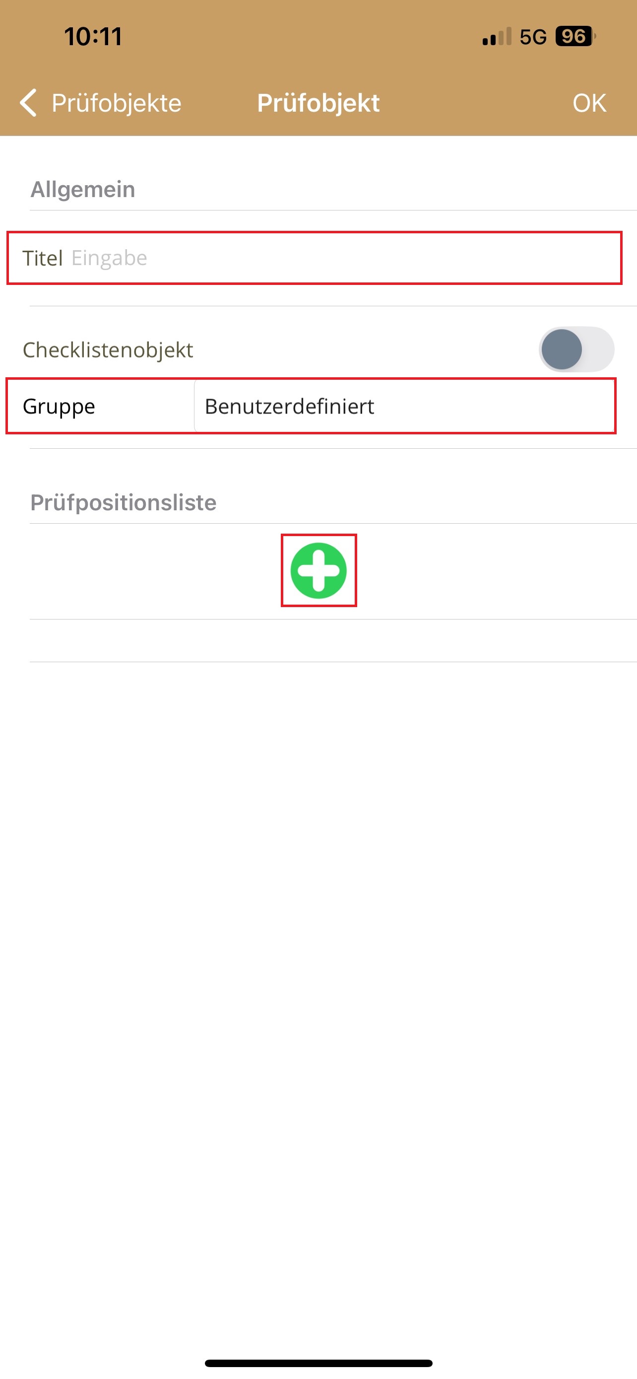 Zuerst den Titel eingeben um welches Prüfobjekt es sich handelt. Danach unten auf das grüne Plus klicken.