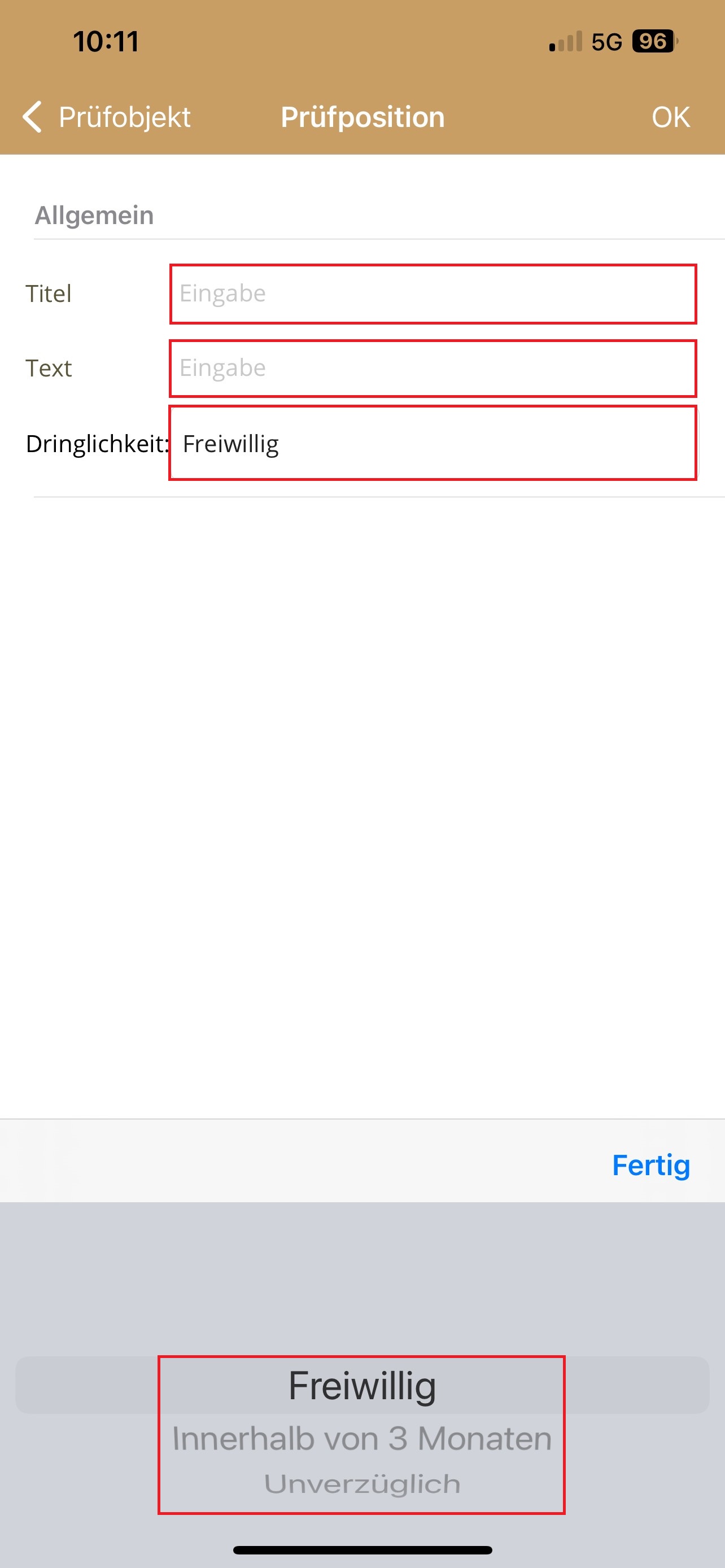 Den Titel eingeben welchen man braucht (z.B Schraube). Danach den gewünschten Text eingeben (z.B es fehlt eine Schraube in xy Bereich). Man kann so viele Prüfpositionen erstellen wie benötigt und auch die gewünschte Bezeichnung dazu geben.