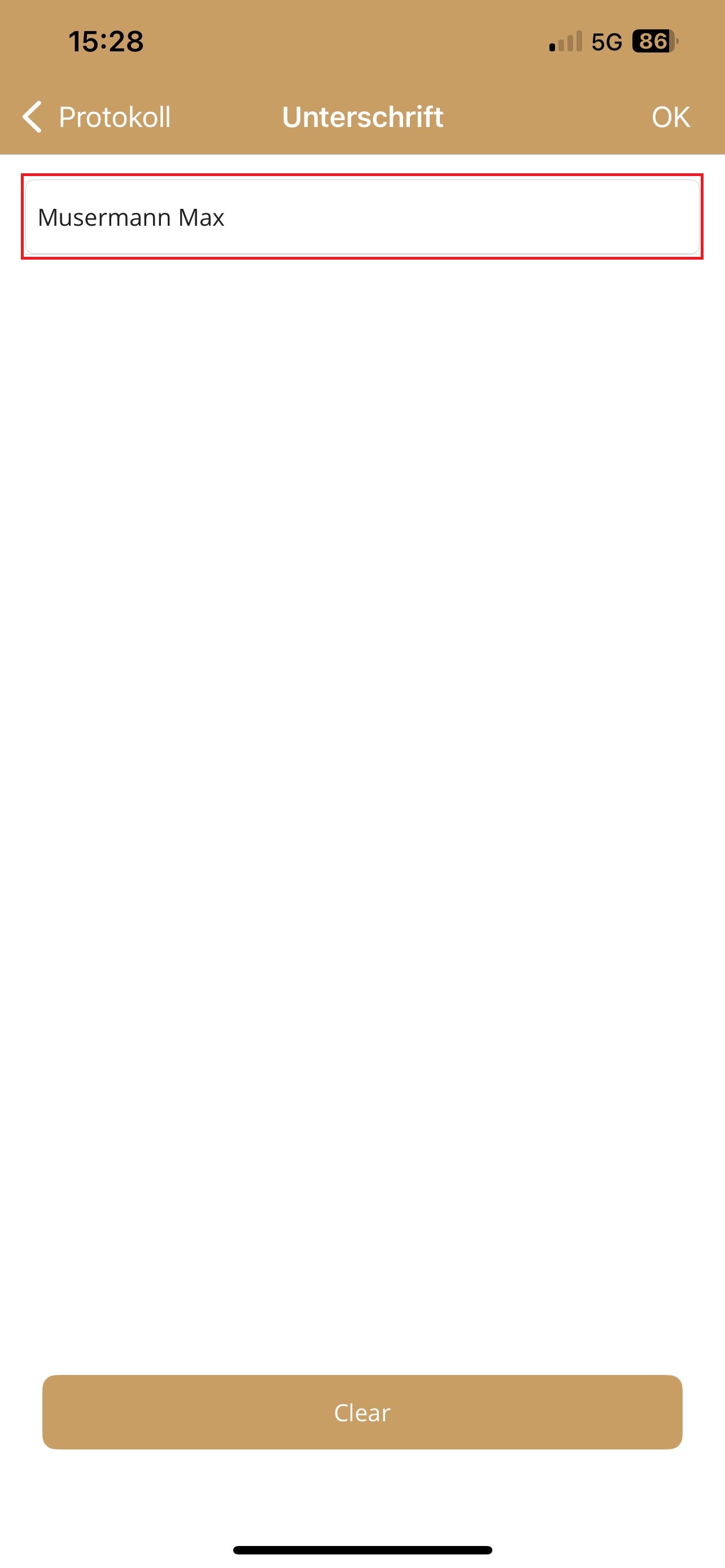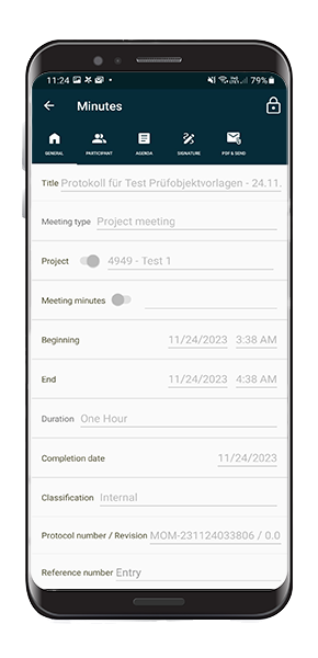 Wenn Sie das Protokoll erstellt haben, finden Sie in der Kopfzeile die Buttons "Speichern" und "Senden". Durch einen Klick auf den Button "Speichern" wird das Protokoll gespeichert. Das gespeicherte Protokoll finden Sie anschliessend unter den Dateien auf Ihrem Gerät.
