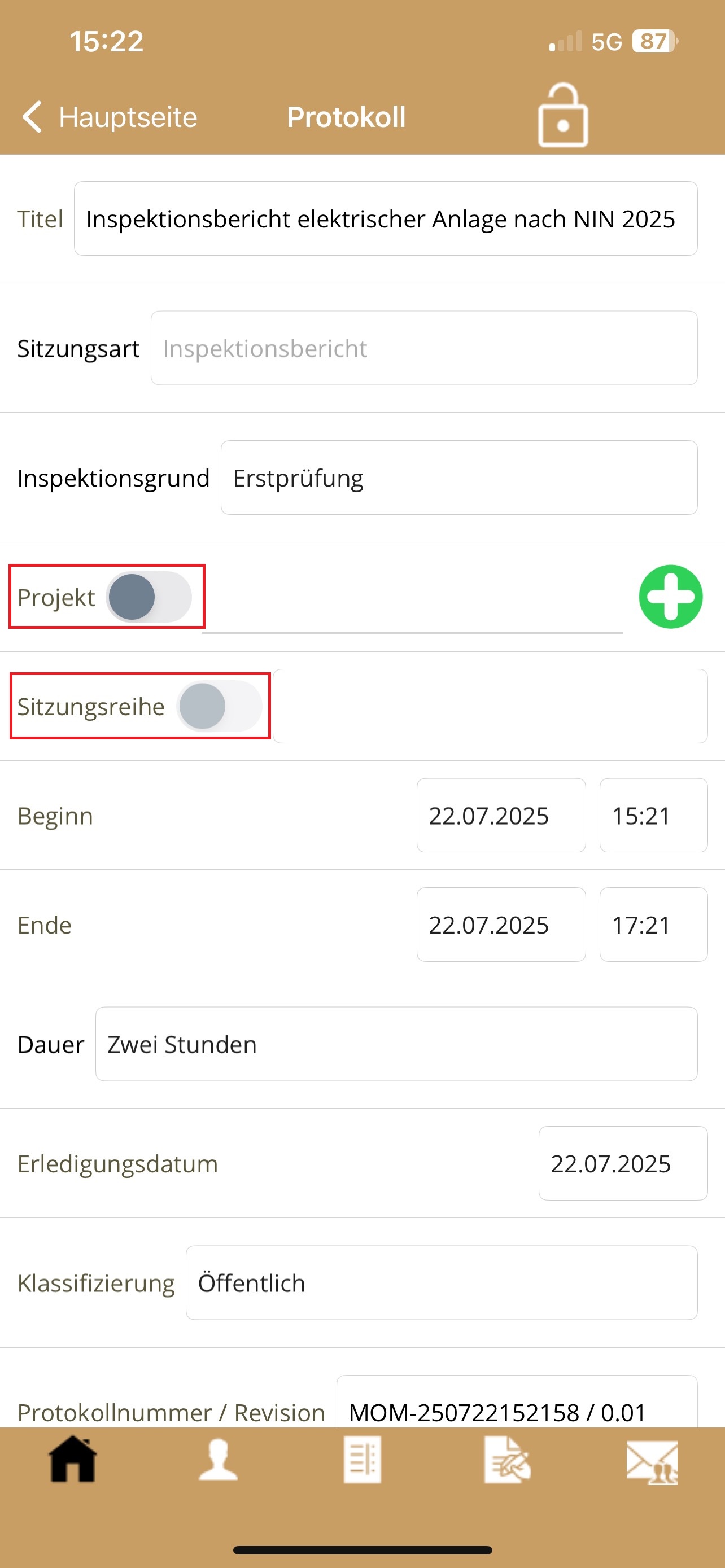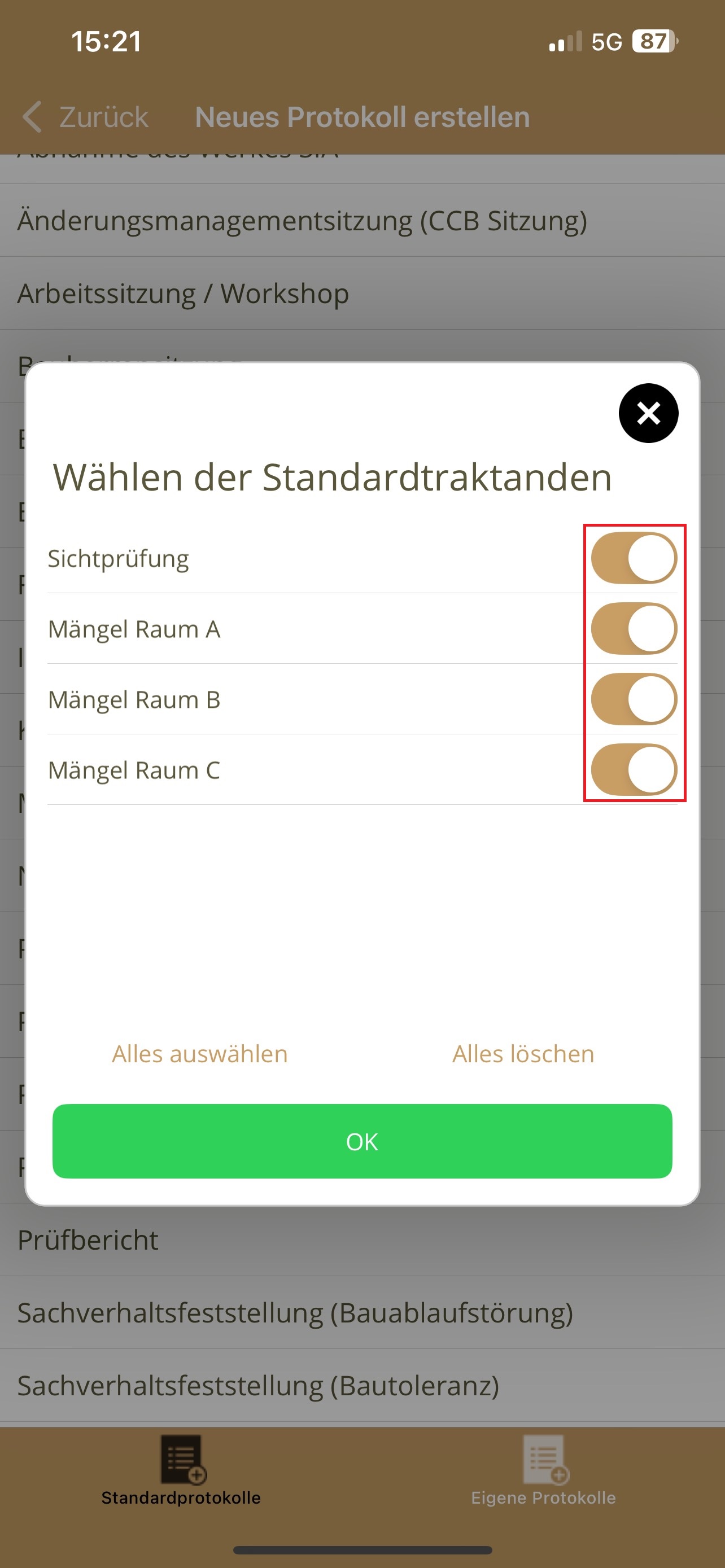 Wählen Sie die passende Vorlage (Inspektionsbericht oder Prüfbericht) und fügen Sie gewünschte Standardtraktanden hinzu.