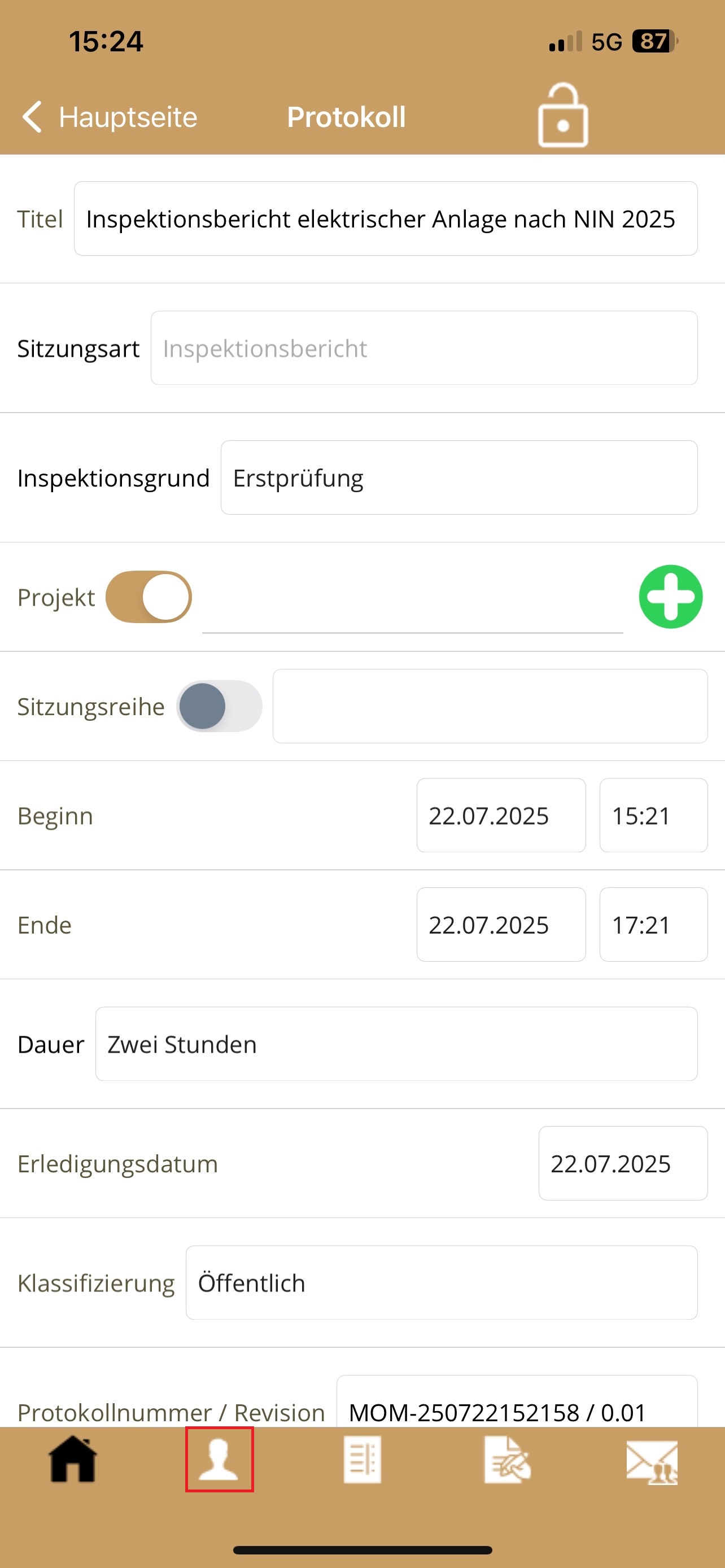Unter „Teilnehmer“ fügen Sie Beteiligte hinzu – mindestens eine Person muss die Funktion „Elektrokontrolleur“ haben.