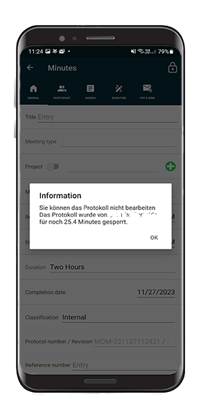 Möchte ein anderer User das selbe Protokoll bearbeiten, wird er informiert, dass das Protokoll durch Sie gesperrt wurde: