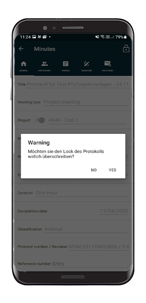 Wählen Sie dort "Ja", heben Sie die Sperre des Protokolls auf und können das Protokoll bearbeiten.